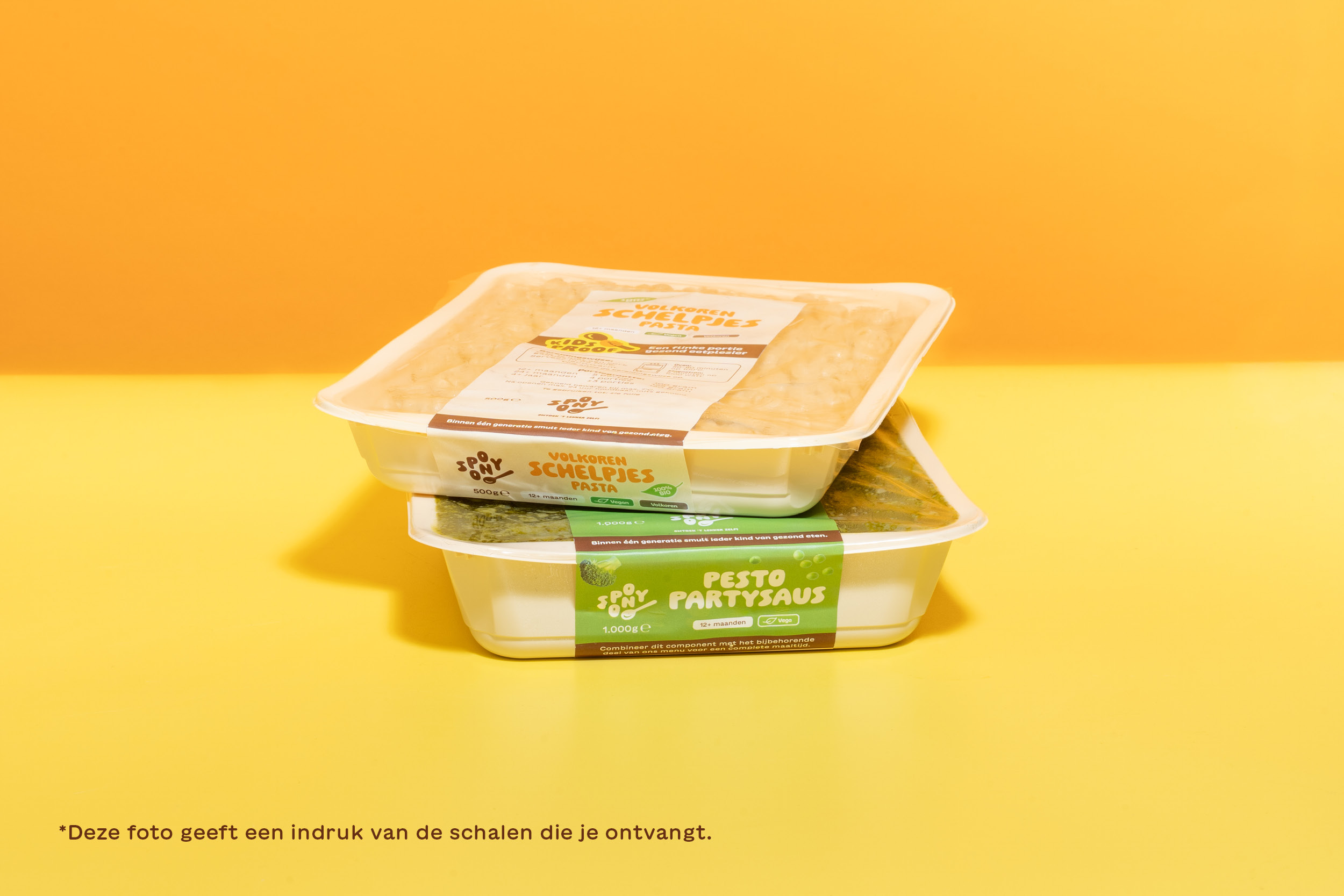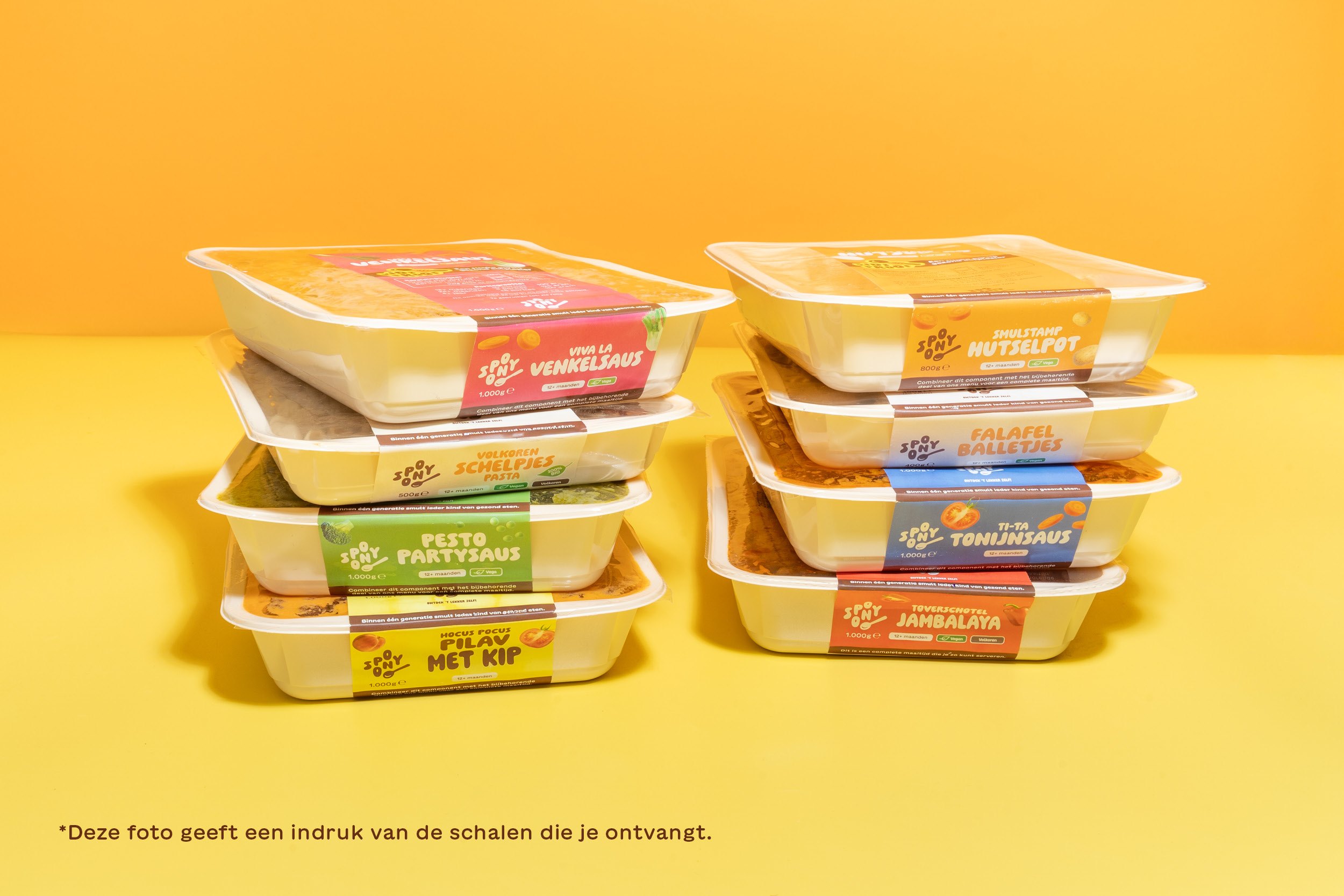 Deze maaltijd is goed voor 3 tot 5 porties en wordt geleverd in 2 schalen: 500 g saus en 500 g rijst.